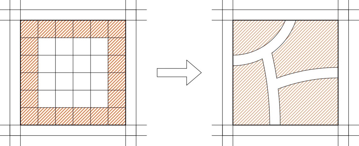 Šrafirana polja na shematskom crtežu lijevo predstavljaju parcele s pristupom do "osnovne infrastrukture", tj. uređene parcele. Prazna polja su neuređene parcele, bez pristupa. Na crtežu desno prikazana je artikulacija područja UPU-om, tako da uvođenjem dodatne infrastrukture cjelokupno područje obuhvata postane uređeno.