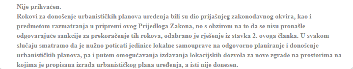 Sjećam se još pisanja primjedbi u javnom savjetovanju o konačnom prijedlogu izmjena i dopuna ZPU. Moje su primjedbe, kao i one svih ostalih, vezano uz čl. 79. i 146., odbijene paušalno, bez ikakvog suvislog obrazloženja. Konačni prijedlog je u travnju 2019. otišao na saborski Odbor za prostorno uređenje i graditeljstvo, gdje planerski revolt također nije uvažen (poznato je da se jedino struka ne razumije u problematiku, svi ostali nazočni su znali bolje).