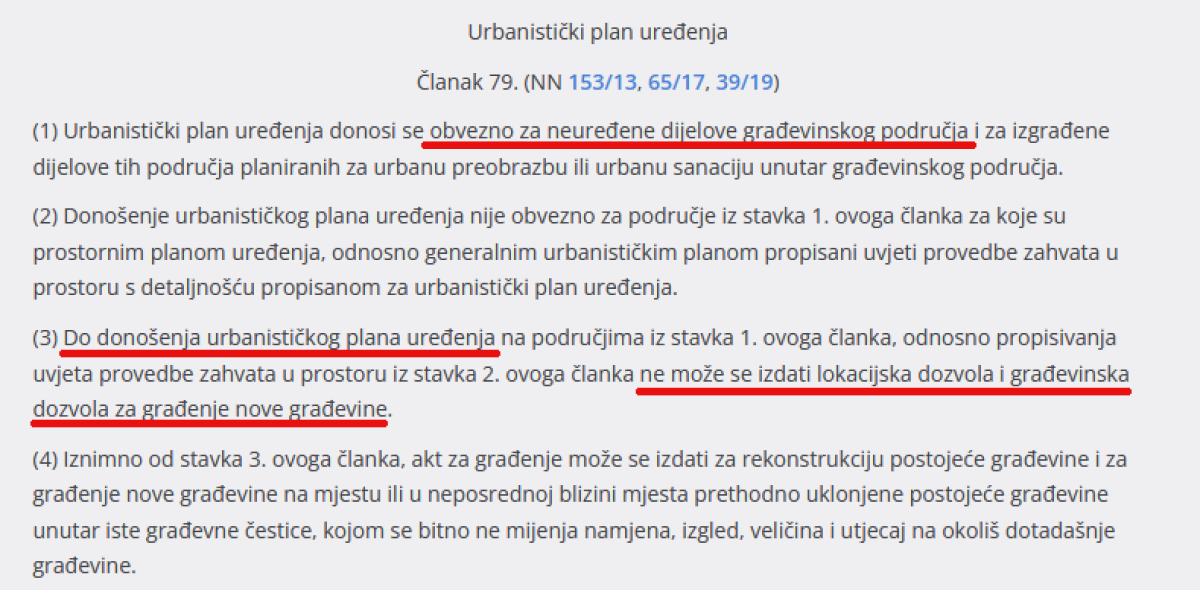 Teza o ugrađenoj kontradikciji odbačena je bez ikakvog suvislog obrazloženja, golim mantranjem da je na uređenim česticama inače moguće izdavanje lokacijske dozvole bez UPU-a. Da, tamo gdje UPU nije ni propisan, ali što ćemo s važećom zakonskom zabranom iz 79/3 za slučajeve kad jest?