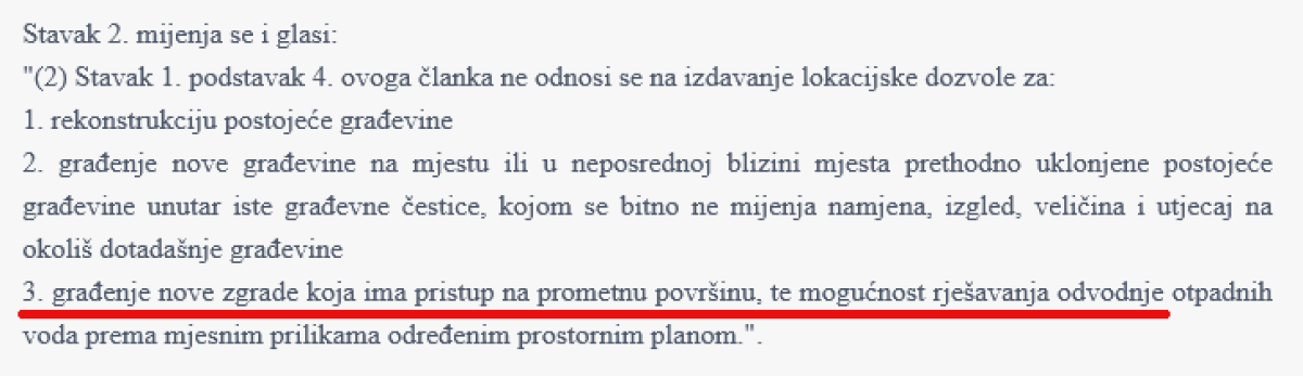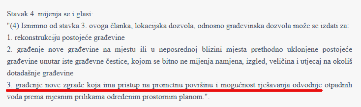 Kad je prije šest godina mijenjan ZPU, u konačnom prijedlogu je stavak 4. članka 79. izmijenjen tako da je dodana još jedna osnova iznimke: "građenje nove zgrade koja ima pristup na prometnu površinu i mogućnost rješavanja odvodnje otpadnih voda".