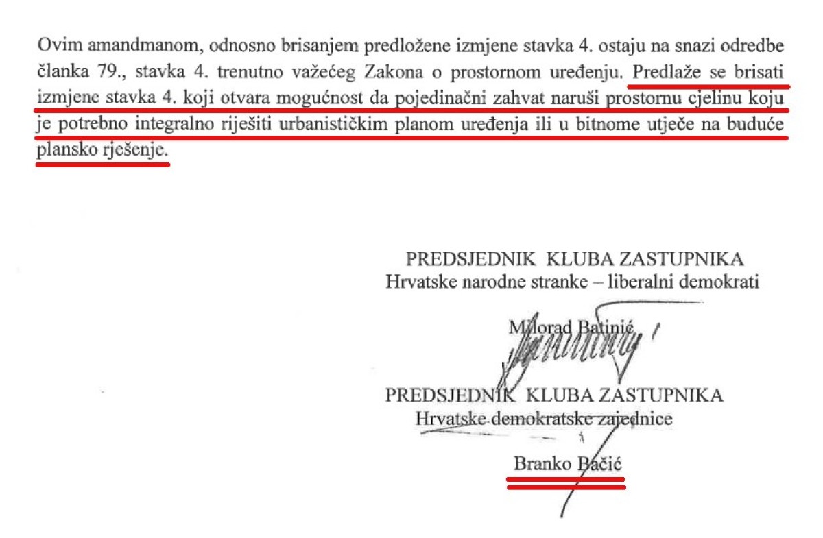 U sljedećem prizoru melodrame: klubovi zastupnika vladajućih stranaka – HDZ-a i HNS-a – daju zajedničke amandmane na konačni prijedlog ZPU-a, koje složno potpisuju predsjednici klubova Milorad Batinić i Branko Bačić. Citiram iz obrazloženja amandmana na čl. 79. ZPU: "Predlaže se izbrisati izmjene stavka 4. koji otvara mogućnost da pojedinačni zahvat naruši prostornu cjelinu koju je potrebno integralno riješiti urbanističkim planom uređenja ili u bitnome utječe na buduće plansko rješenje." Riječ da bih rekao. Sam ne bih bolje sročio!