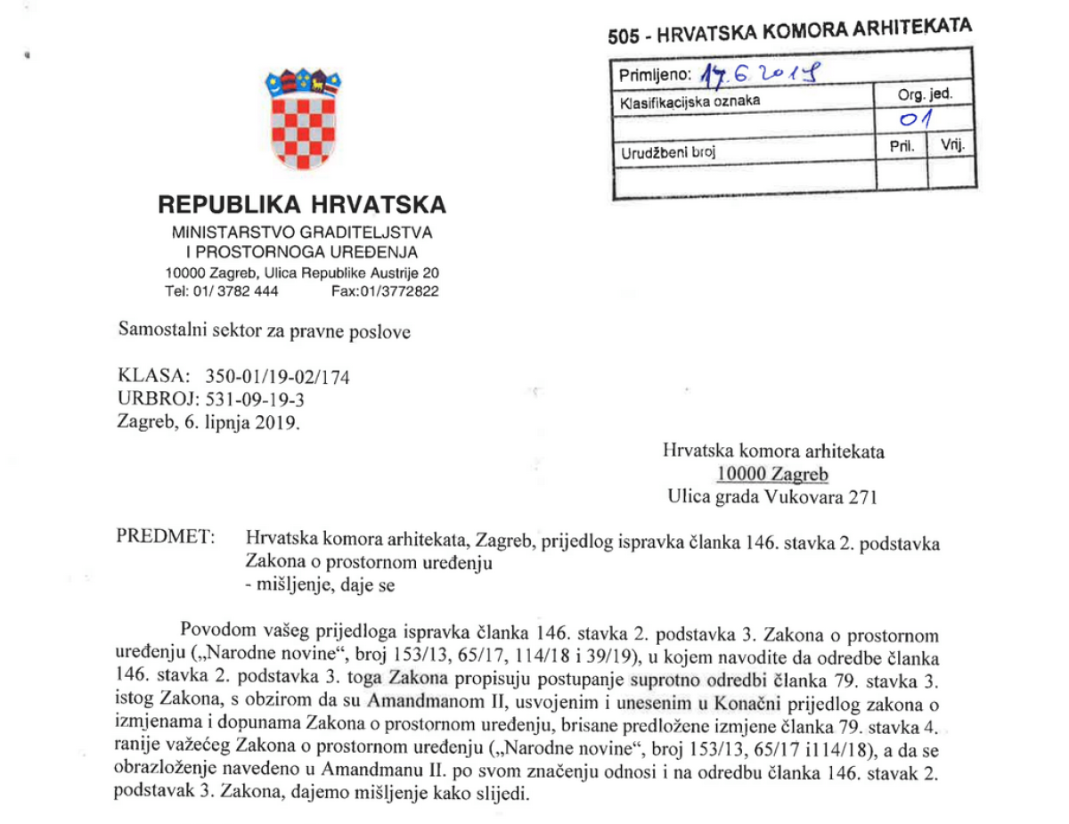 Zaglavlje dopisa resornog ministarstva Hrvatskoj komori arhitekata od 6. lipnja 2019.