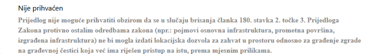 Odgovor Ministarstva prostornog uređenja, graditeljstva i državne imovine na primjedbe na prijedlog čl. 180. st. 2. točke 3. novog zakona o prostornom uređenju.